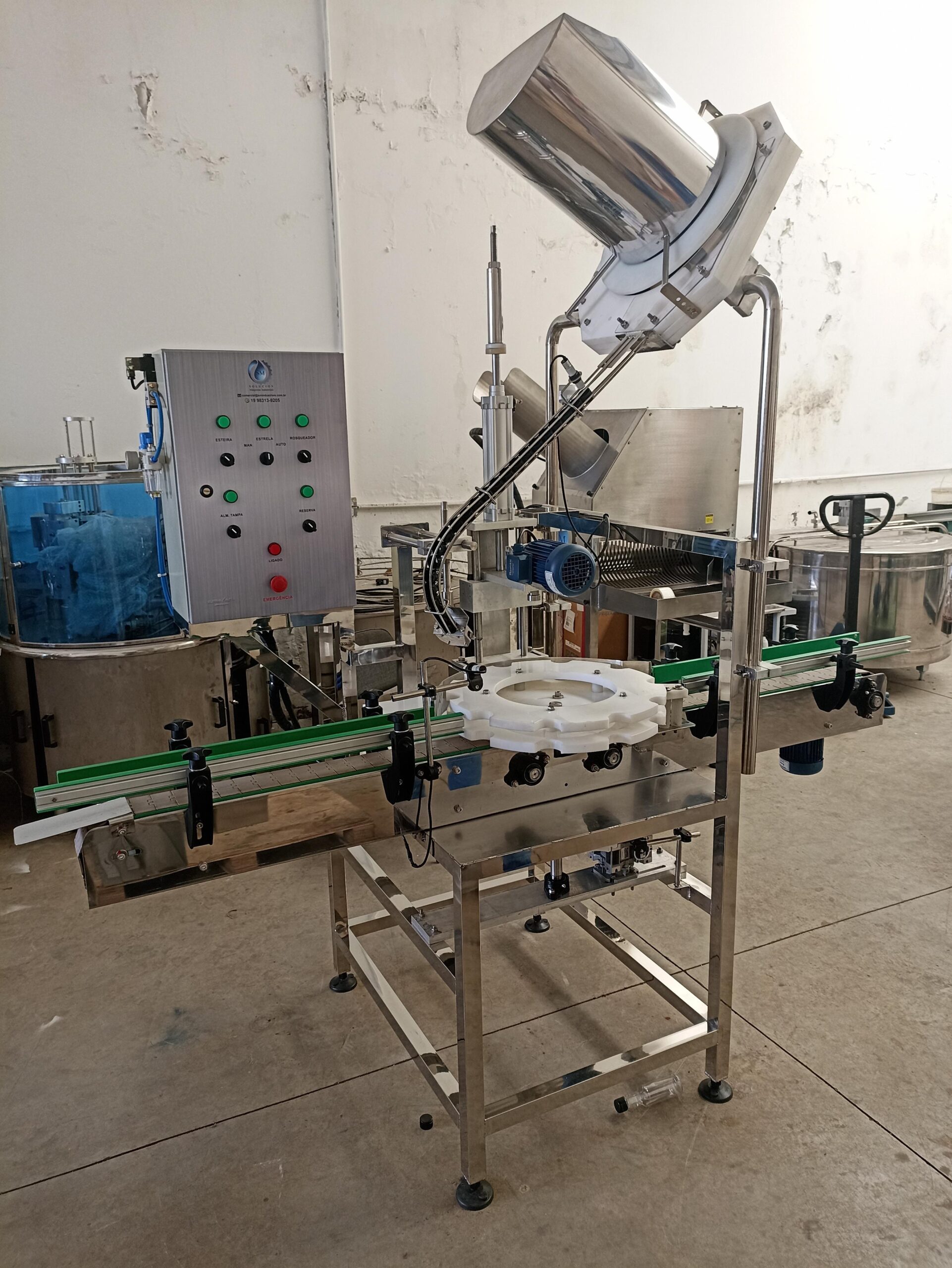 Primeiro, o frasco chega posicionado pela esteira e guias laterais. Em seguida, a tampa é orientada por alimentadores e dispositivos de seleção. Logo depois, a tampadeira aplica o fechamento com torque regulado por embreagem, servo ou sistema equivalente. Por fim, sensores verificam presença e altura da tampa, liberando apenas as unidades conformes. Consequentemente, a qualidade final permanece consistente, mesmo em alta cadência.